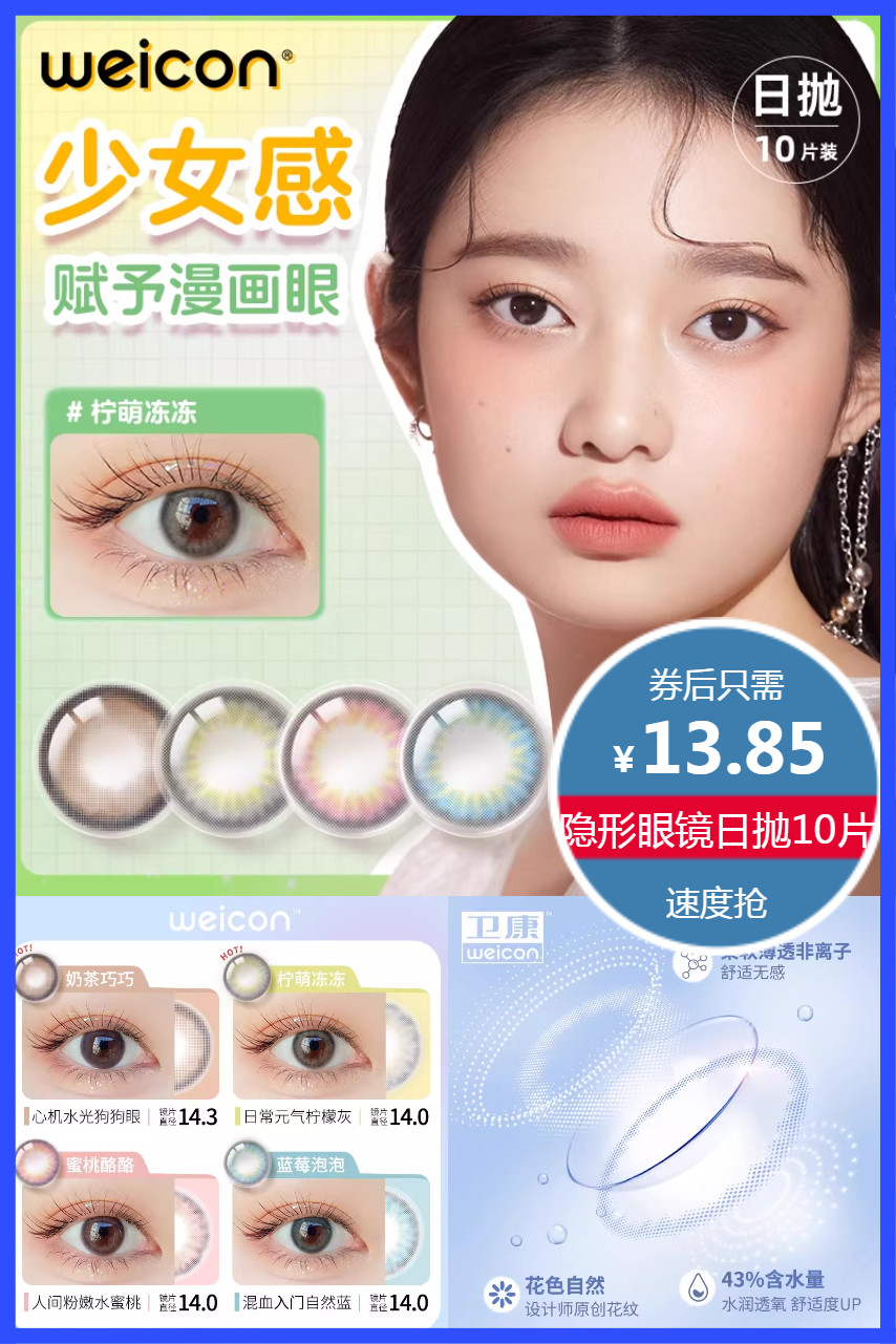 淘金币3.15+88会员0.85叠加劵到手13元!卫康10片日抛美瞳隐形眼镜,度数可选,多种花色可选,甜酷系列,甜酷入瞳,自然美眸,柔软薄透,舒适无感,43%含水量水润透氧,百搭变身大眼美女