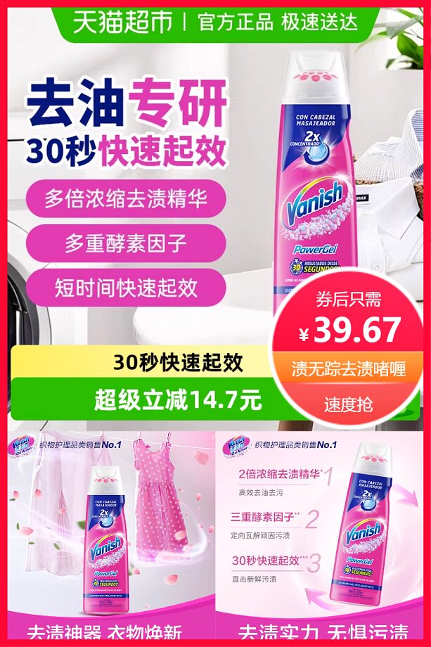 88vip省2.25元+超市立减14.7元+券5元+88vip省2.1元+点击右上角三个点进入淘金币省5.23元后约37.42元,2倍浓缩去渍精华,高效去油去污,三重酵素因子,定向瓦解顽固污渍,30秒快速起效,有效祛除宝宝自主吃饭污渍油渍,火锅烧烤油渍污渍,彩妆!