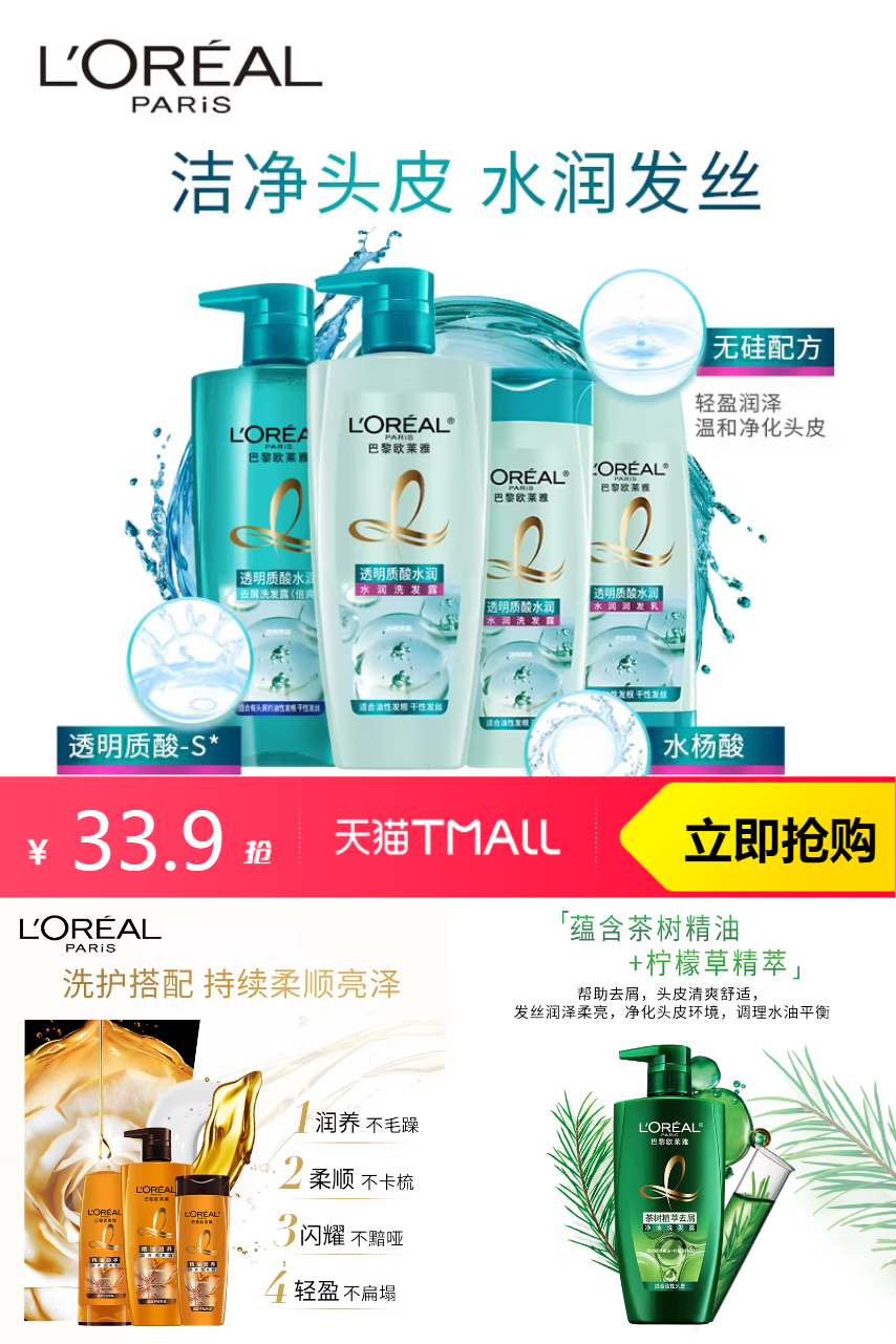 【叠加3.98元淘金币+4.69元红包+叠加88vip1.65元,到手23.58】欧莱雅茶树、质酸、精油润养洗发水500,72H*劲爽头皮,水润发丝。
