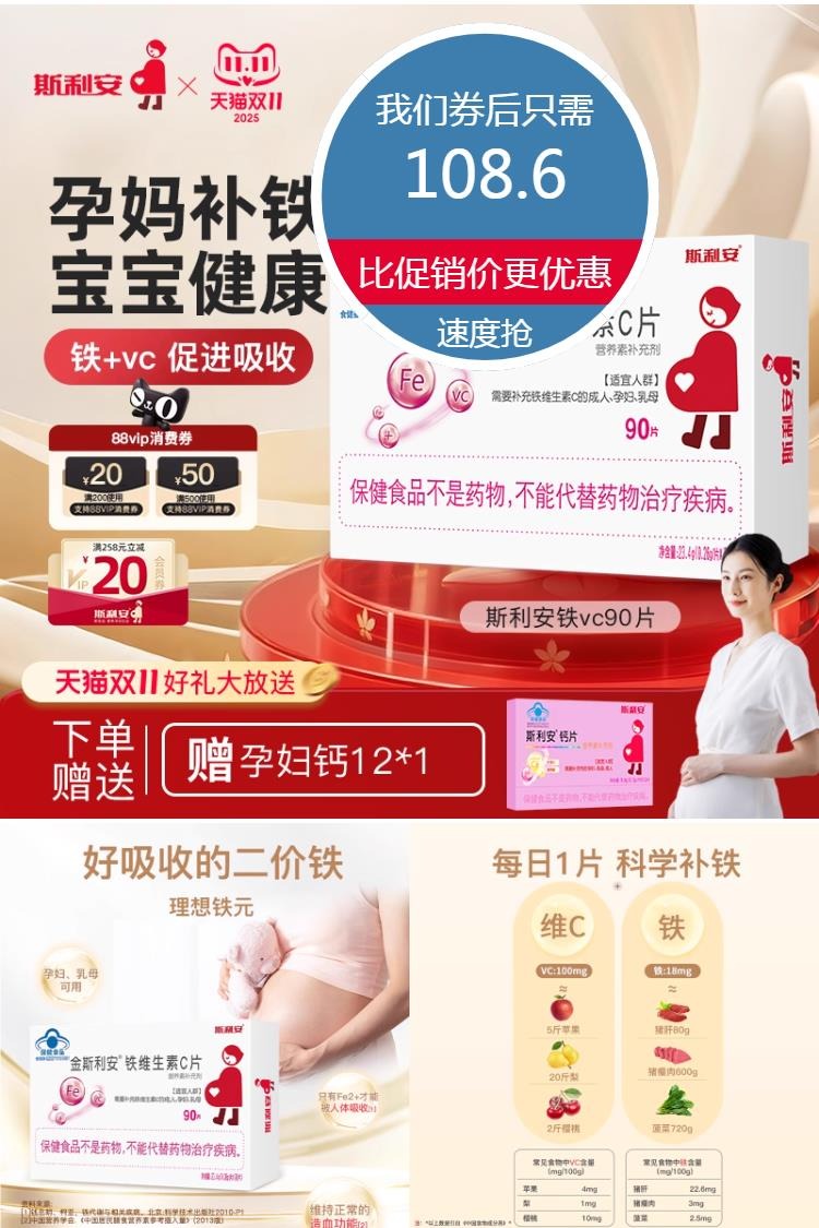 【88VIP+消费券!送钙*2盒】金斯利安孕妇补铁剂,铁+VC,促吸收,好吸收的二价铁,每日一片,科学补铁,特加VC,均衡、科学、营养,满足孕妈补贴需求!赠运费险~