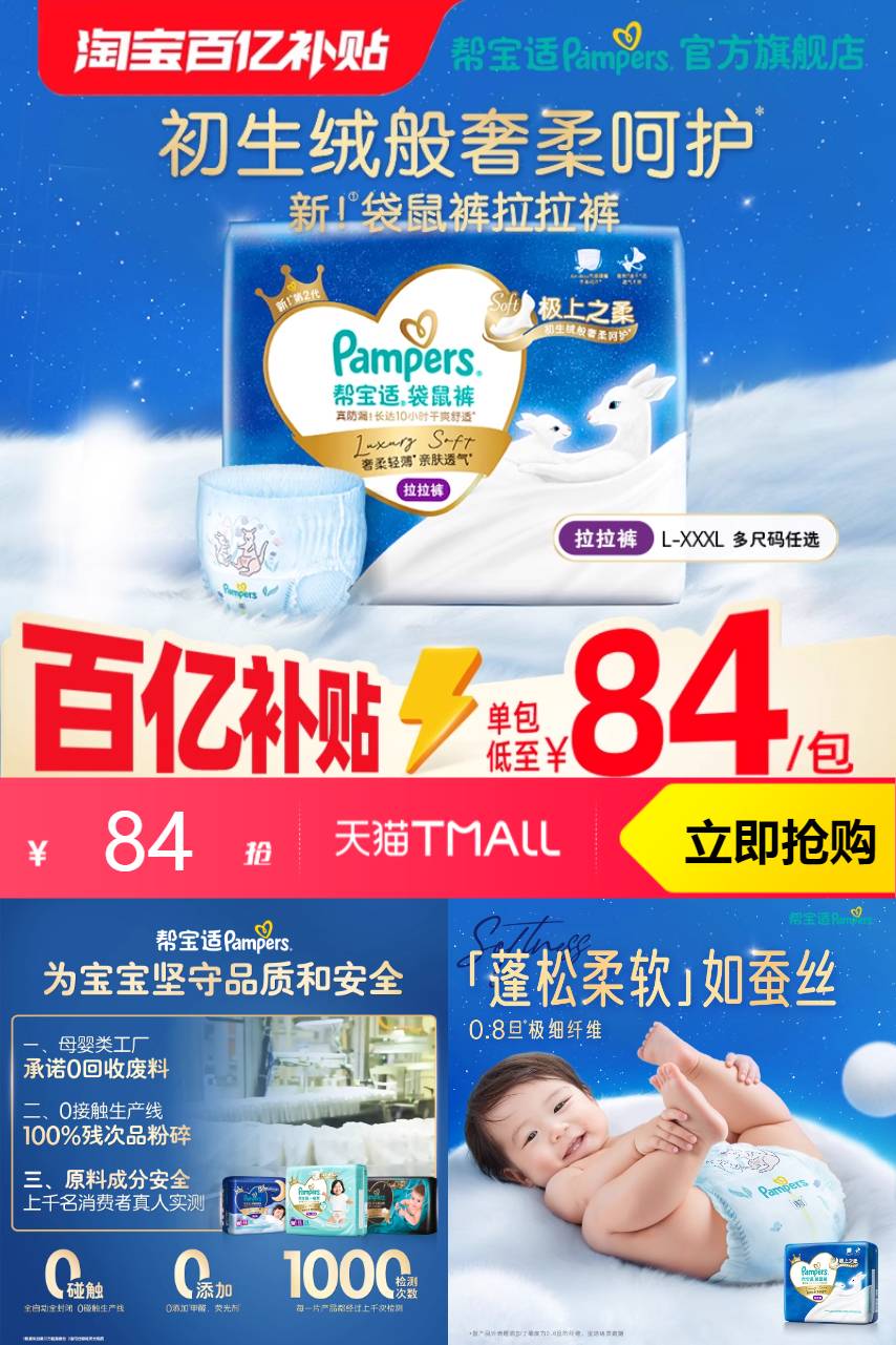 【百亿补贴下单!】新帮宝适袋鼠裤拉拉裤L-XXXL尺码任选,蓬松柔软如蚕丝,0.8旦极细纤维~