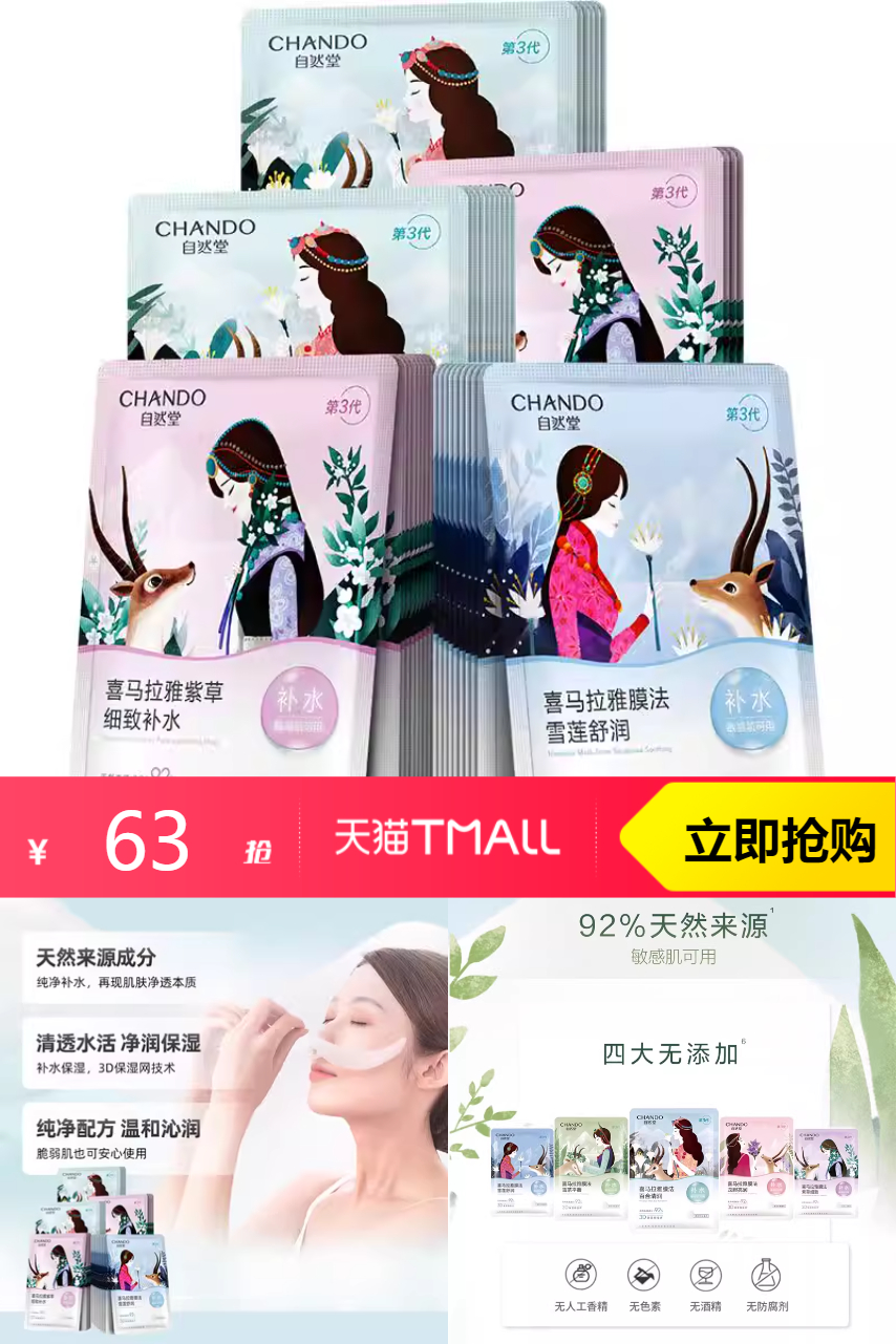 【10点开始,112-立减24-券25-88vip95折3.15-淘金币8.24-淘礼金2.52=49.09元,凑200-25消费券和标题上方领券处599-60购物券到手34元+。】自然堂喜马拉雅植物面膜40片,补水保湿,舒缓肌肤改善。