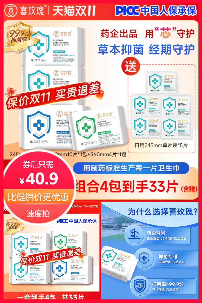 券后40.9!送5片日用单片装!到手33片抑菌卫生巾,用‘芯’抑菌,萃取多种草本精华,权威检测,抑菌率打99.9,内含抑菌芯片,核心专利技术,每包卫生巾都可溯源,实力药企,全链路洁净工厂,用制药的标准制作每一片卫生巾,多重呵护,开启经期舒爽,用心守护,让爱更贴心!!