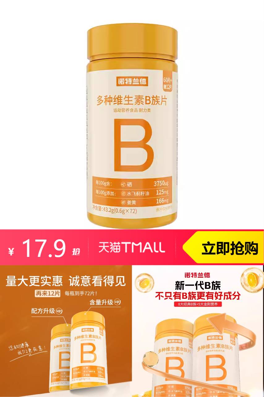 【88VIP95折抵扣0.9,淘金币抵扣2.62元,消费券抵扣1.79元,到手价12.59元】诺特兰德多种维生素b族复合维生素牛磺酸,补充日常所需,味道好,咀嚼方便,男女都适用。