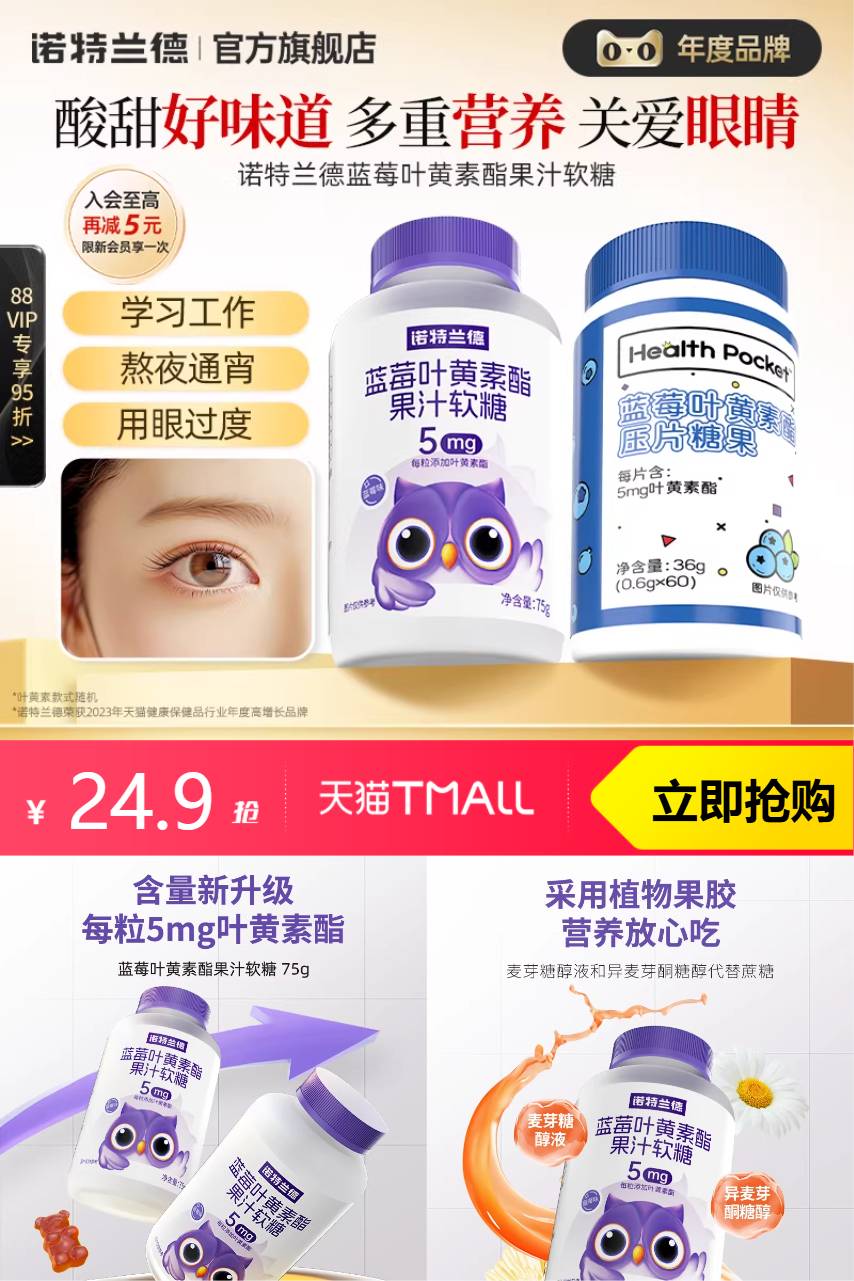 【88VIP1.15,淘金币1.47,政府补贴2.03,到手价18.35。】诺特兰德蓝莓叶黄素酯软糖儿童成人老年,高含量叶黄素酯,用眼常备,营养全面,关爱眼睛健康。
