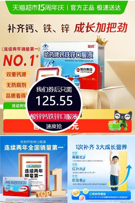 【猫超首页超级补-贴频道,领12元红-包,淘金币自动抵扣2.1,88会员到手125.55】哈药三精蓝瓶口服溶液90支,营养均衡,三效同补。丰富钙铁锌元素补充,液体形势易吸收