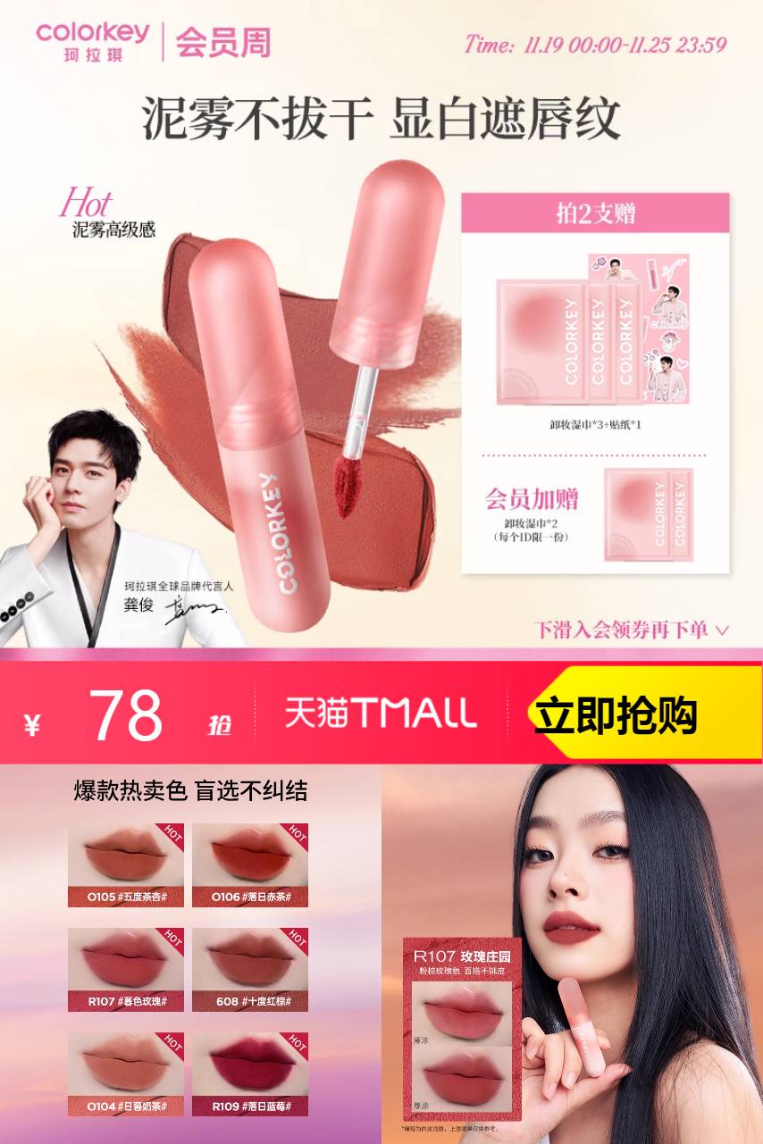 【叠加300-30到手约68.2 两支】拍2珂拉琪唇泥雾面哑光唇釉!真的不要太好看!迪丽热巴,龚俊全球代言、入选天猫榜壹!显色高饱和、泥雾显色不拔干!