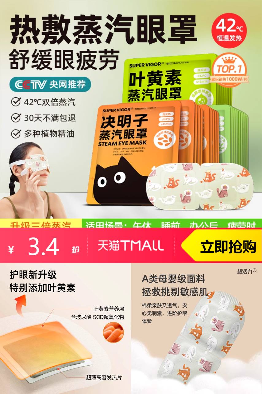 【26号早上10点天降福利,报名价5.4元,官方补贴2元,到手价格3.4】超活力热敷蒸汽眼罩10片装3选1,热敷蒸汽眼罩舒缓眼疲劳。