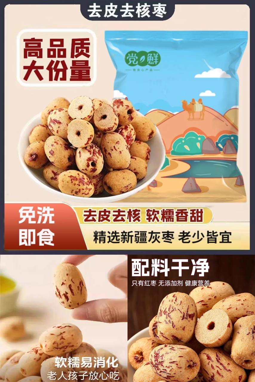 精选新疆灰枣,去皮无核免洗即食,250克袋装大容量,营养美味轻松享~9.9元抢购轻山悦色去皮红枣,去皮率高更省心,居家办公养生好选择!新鲜直达餐桌的健康滋味,快来体验