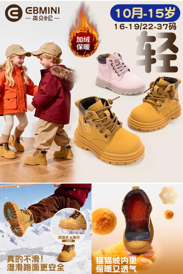 英贝米尼儿童马丁靴温暖上线!加绒保暖设计,防滑耐磨大底,宝宝冬季出行更安心~男女童款全都有,时尚大黄靴造型,耐穿又百搭,宝妈省心首选!让宝贝暖暖过冬,舒适每一步