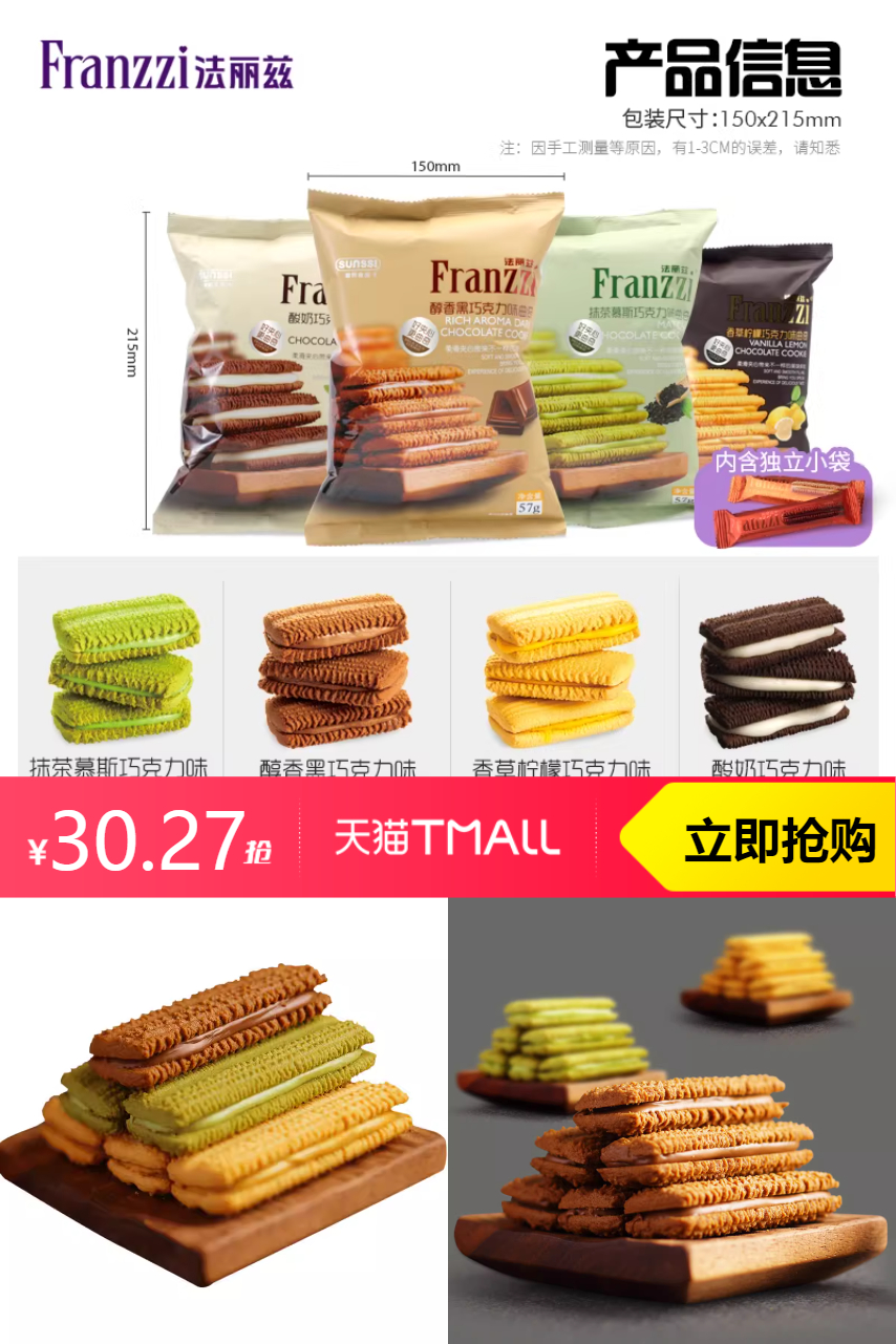 【原价59.4—店铺满减22—超级立减7.13—淘金币2.17=到手价28.1元9件 右上角点三个点 右下角领淘金币拍 可抵2.17元】各大超市都在卖的法丽兹来活动了!!! 法丽兹旗舰店•曲奇饼干零食合集 跟传统干巴巴饼干不一样!曲奇更酥更香更美味! 强推抹茶夹心曲奇!60微米细腻夹心,入口即化!