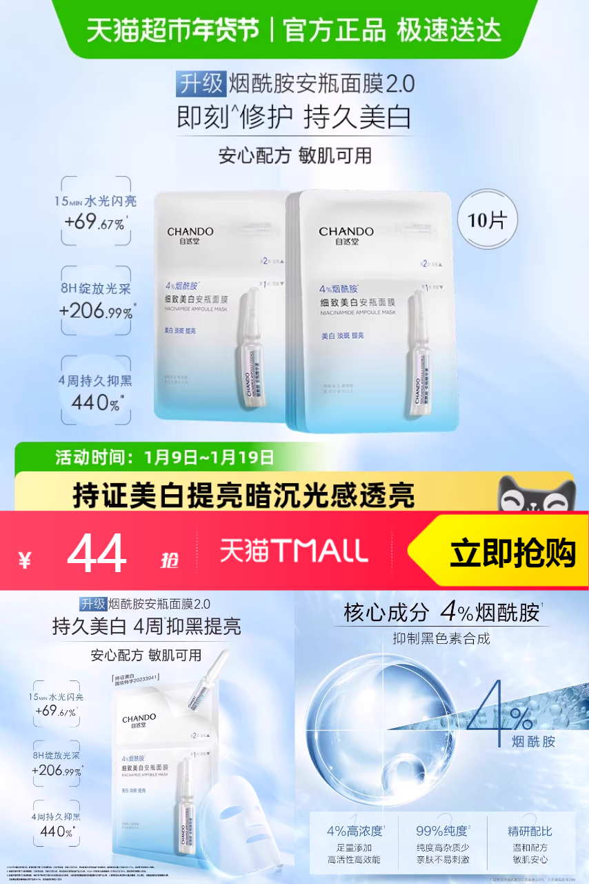 【79-立减10-券25-淘金币6.32-淘礼金2.2=35.48元。凑消费券到手更低。】自然堂烟酰胺细致美白面膜10片,提亮肤质改善泛红。
