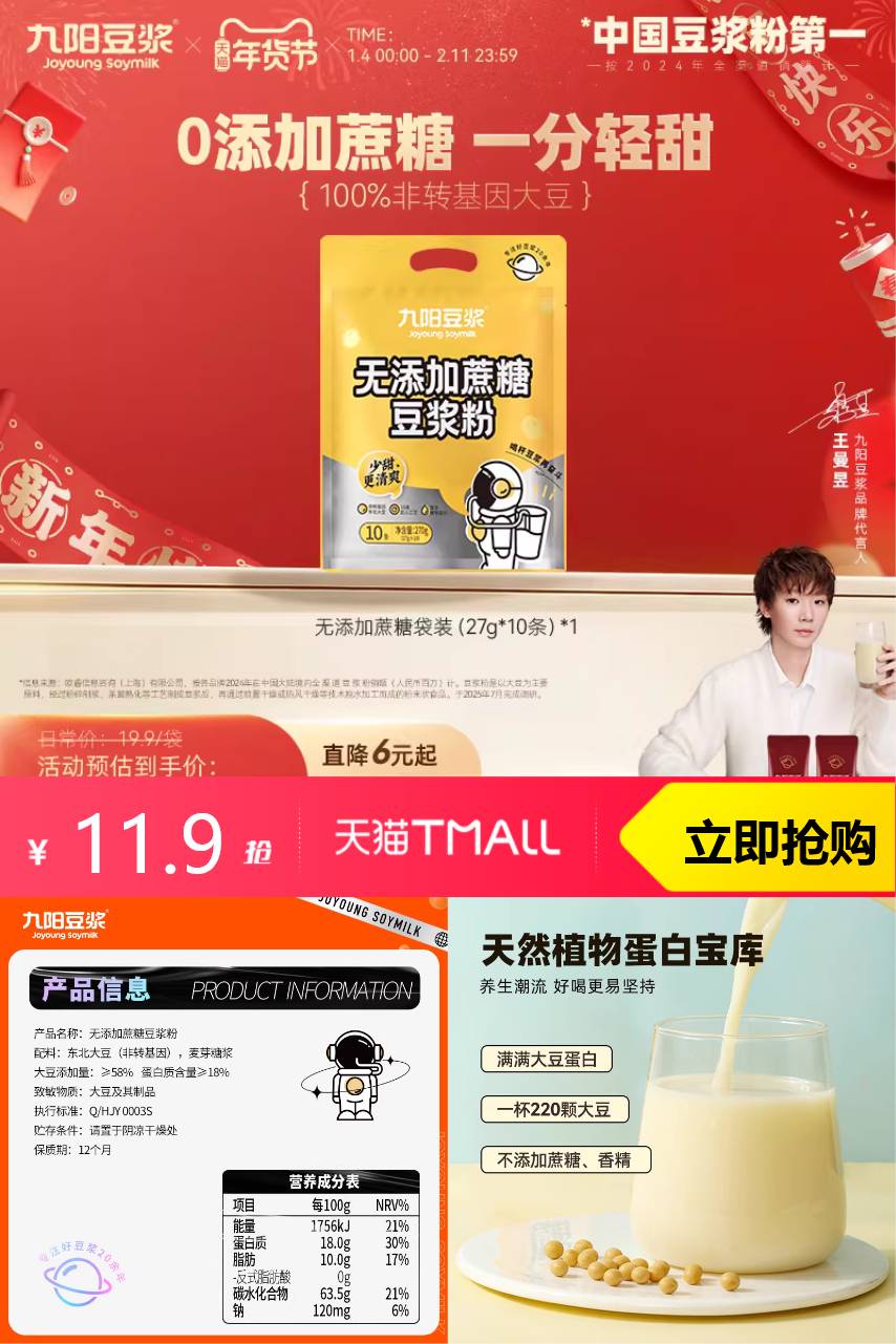 【淘金币可抵扣1.36,到手价格10.54】九阳豆浆无添加蔗糖豆浆粉10条装学生营养早餐,营养又健康~