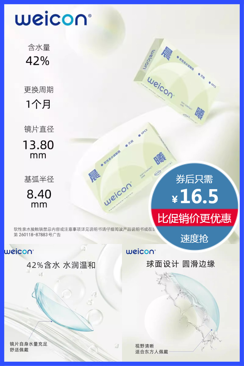 立减2.6元+88会员+淘金币+天降3元+福利包叠加劵到手约11.54元!卫康晨曦月抛美瞳隐形眼镜2片,非离子材质,敏感也舒适,轻盈、透亮、水润,42%含水水润温和,球面设计,圆滑边缘,视野清晰,水润透痒!