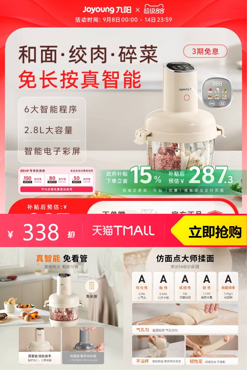 【惊喜立减32.8+88vip+淘金币+消费券+政府补贴到手201.76】九阳和面绞肉机新款家用多功能小型,采用全新升级的电机技术,无论和面还是绞肉,都只需轻轻一按,便可在短时间内轻松完成。
