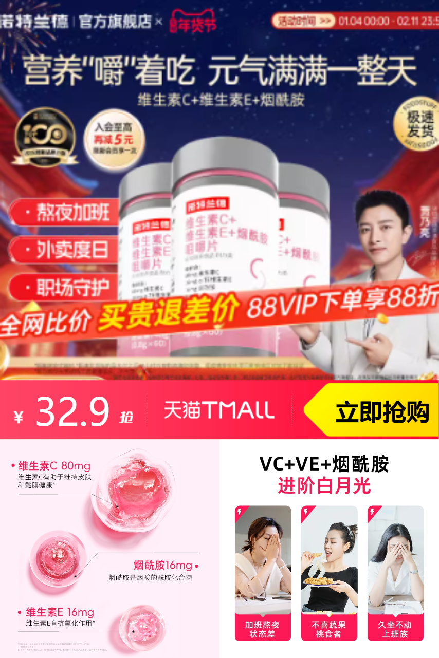 【官方立减8元,店铺会员立减2元,88VIP优惠1.65元,淘金币抵扣4.87元,凑满200减25消费券到手26.38元。】诺特兰德烟酰胺维生素c维生素e咀嚼片,肌肤养护好搭档,三效合一,美容佳品!日常保健新选择,天然维生素C&E。