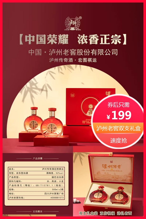 立减291元+跨店立减210元后约199元,泸州老窖传奇酒,宏图祺运,浓香型52度礼盒装,固态法白酒,甄选小麦,高粱,水酿造,双支礼盒装,双倍送礼,倍有面!