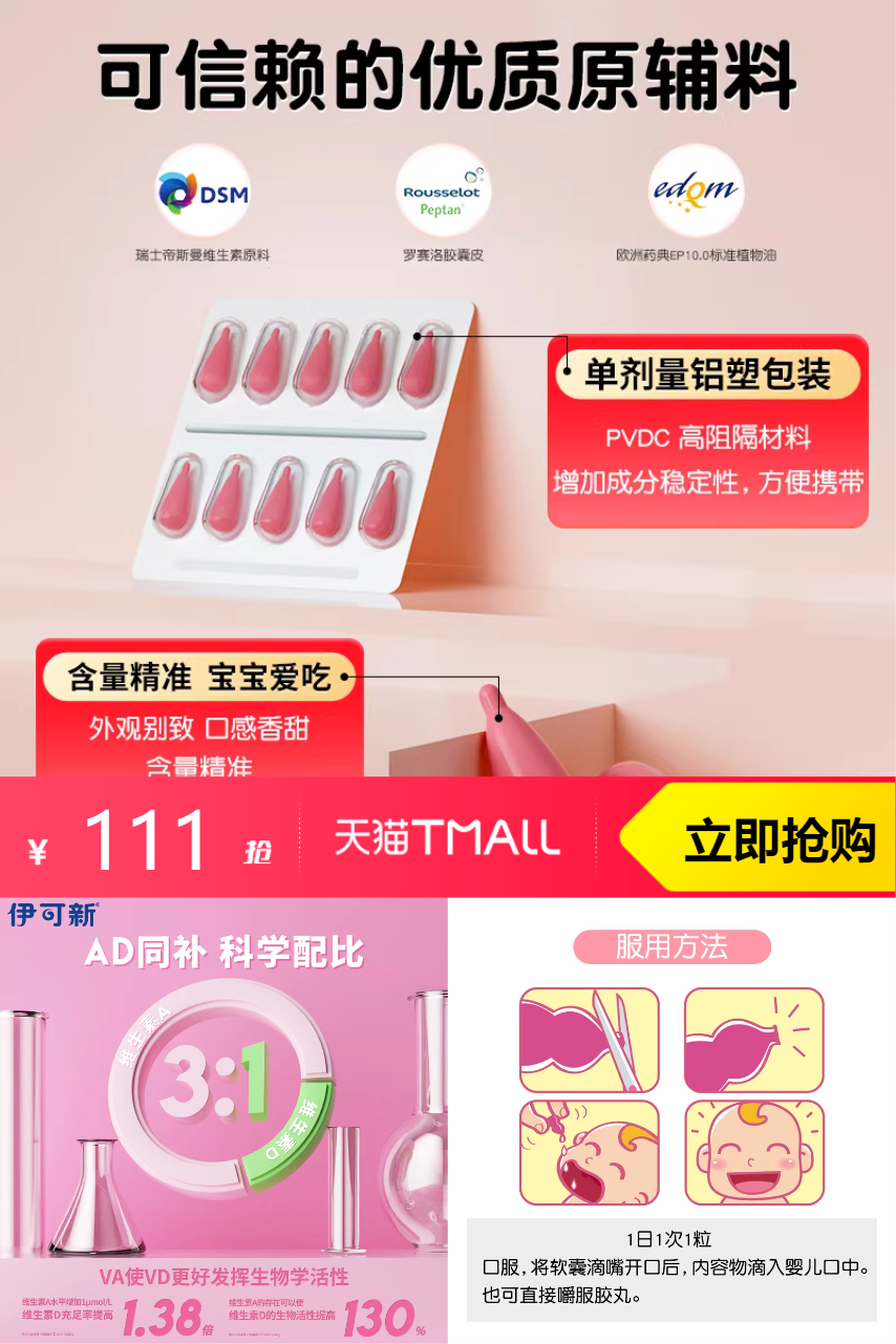 【叠加淘金币6元+凑消费券200-25=到手仅需91.87元。合计单粒/0.61元】伊可新维生素AD滴剂,一岁上岁达因维生素A佝偻病夜盲小儿手足抽搐。