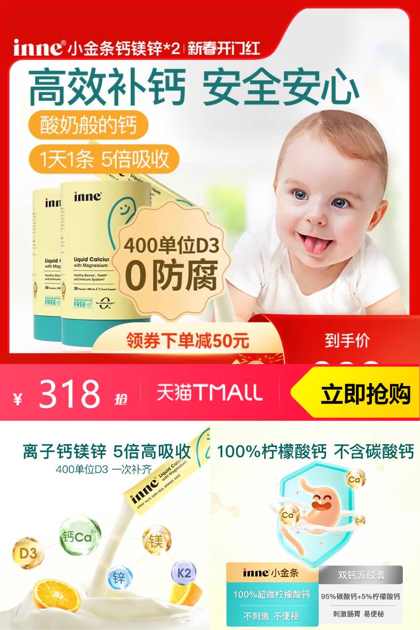 【立减55+淘金币13.74元304.26+叠加消费券到手266.23元】inne因你小金条钙镁锌儿童钙液体钙*2盒,含有丰富的钙质和其他必需的营养元素,为宝宝的骨骼发育和健康成长提供了充足的营养支持~