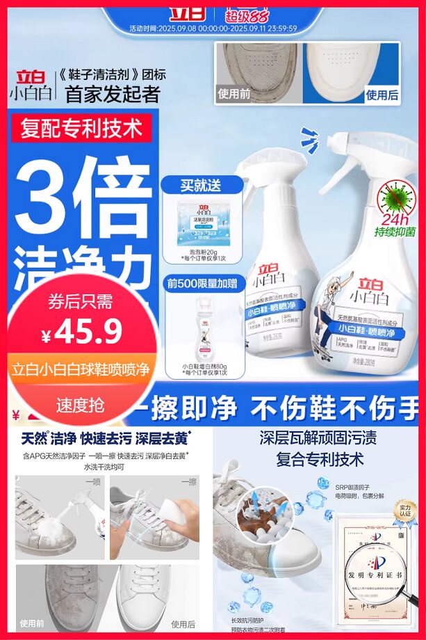 买就送立白小白白泡泡粉20g,拍280g*2瓶选项,超级立减8.9元+券3元+下拉详情淘金币抵扣1元后45.9元,单瓶只需22.9元,小白鞋去污神器,含天然氨基酸成分温和不伤鞋面,泡沫绵密,即温和,又有效,天然洁净温和不伤鞋,亲肤不伤手,清新花果香。