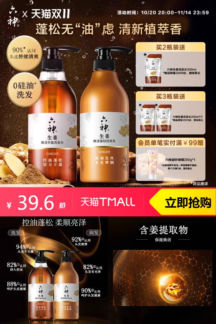 【再送200ml生姜洗发水。叠加淘金币补贴4.296,天降红包2-5元,再叠加消费券,到手只要29.9元】六神生姜洗发水720ml护发素720ml,强健秀发 一套柔顺蓬松,姜*焕活 发丝丰盈强韧~