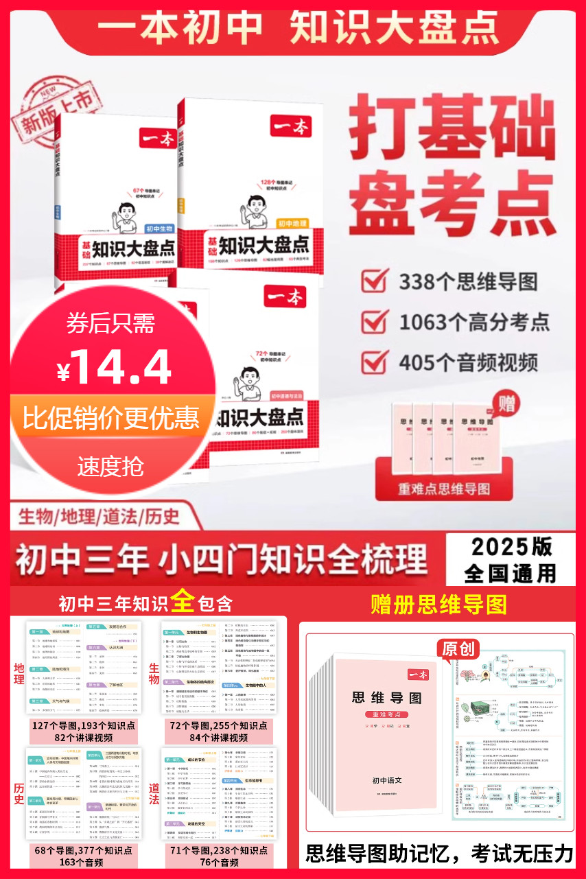 【赠重难点思维导图,当天发货】2025新版一本初中知识大盘点,338个思维导图,1063个高分考点,405个音频视频,打基础盘考点!知识全、方法全、考点全,初中三年,小四门知识全梳理!