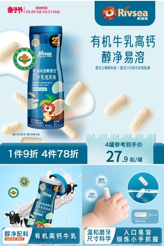 【159.2-官方9折-拍四件7.8折-11券=97.2,叠加88会员92.39元单盒到手23元】有机稻鸭原生,高钙婴幼儿泡芙条。禾泱泱有机婴儿泡芙条温和磨牙,蓬松细腻,入口易溶,钙有助于骨骼与牙齿的发育,高钙配方,助力宝宝成长。