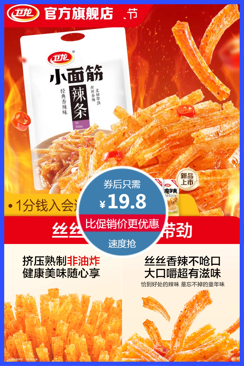 淘金币叠加劵到手19.57元!卫龙小面筋辣条282g*2包共26小包,香辣油润,紧实耐嚼,每一根都吸满调味,每一口都软糯过瘾,丝丝香辣不呛口,大口嚼有滋味,挤压熟制非油炸,健康美味随心享