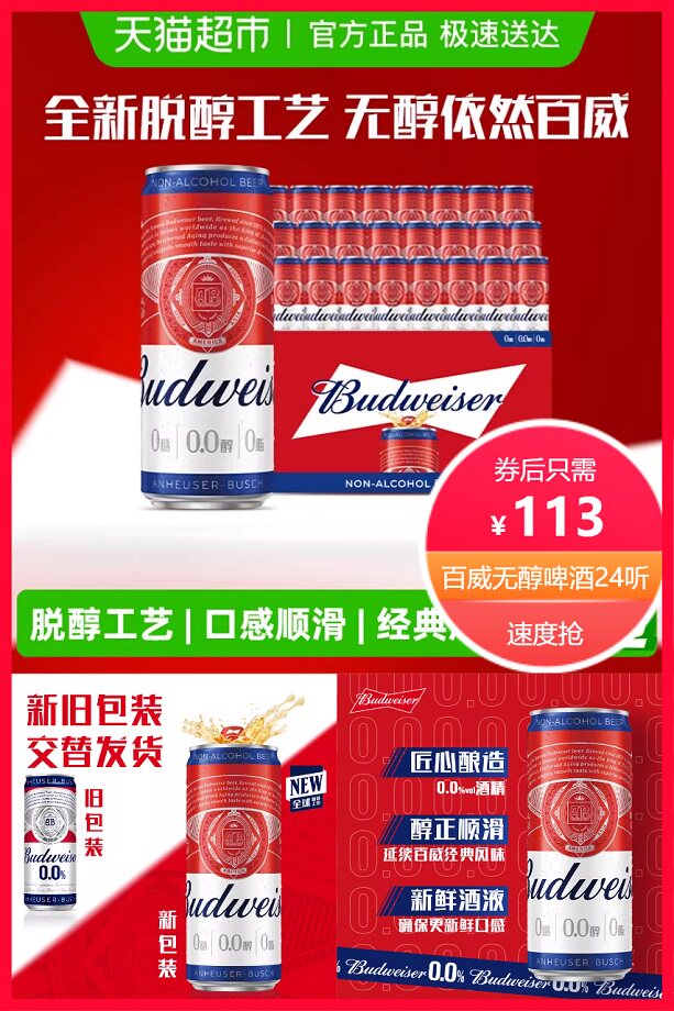 超市立减39元+券5元+88vip省5.75元+淘金币省2元后约107.25元,精选水,麦芽,大米,啤酒花,酵母,维生素c,低酒精度,口感依旧,以茶带酒,就选百威无醇!