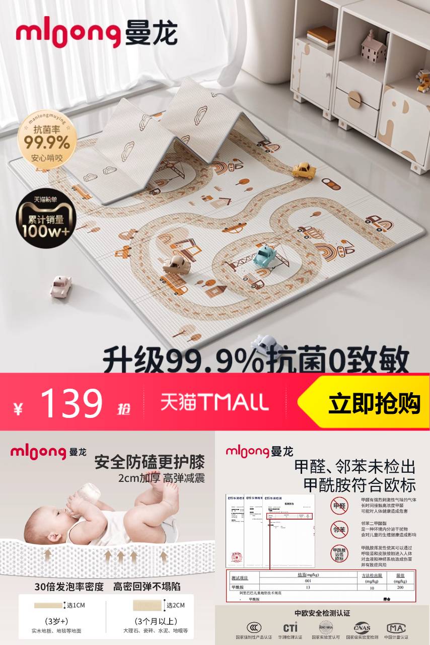【备注TK 额外赠送一箱云柔巾(10包)】195*148*1cm多村道路,曼龙宝宝爬行垫折叠儿童无毒xpe婴儿爬爬垫加厚家用。