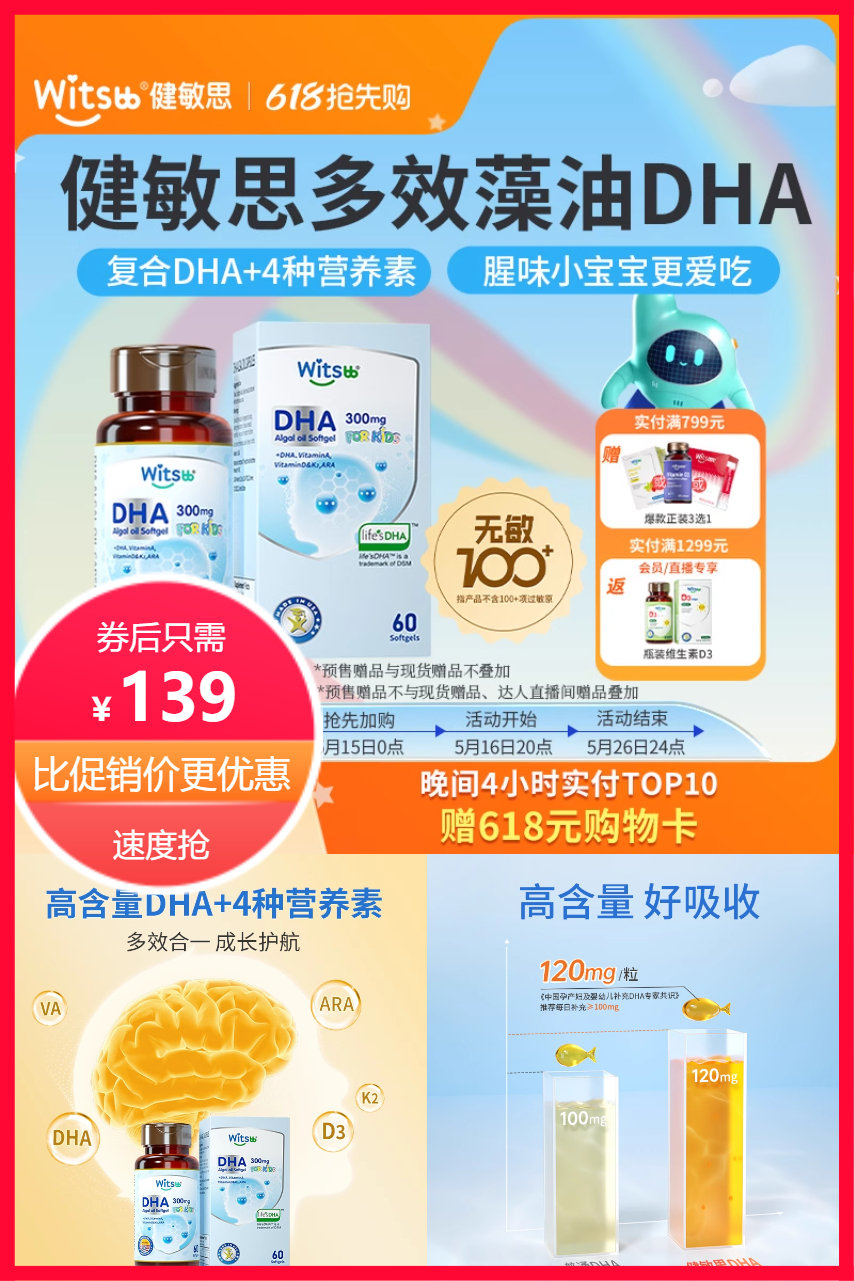 【可凑消费券】witsbb健敏思婴幼儿多效无敏藻油dha60粒,促进婴幼儿的大脑发育,增强视力!是婴幼儿的“脑黄金”!