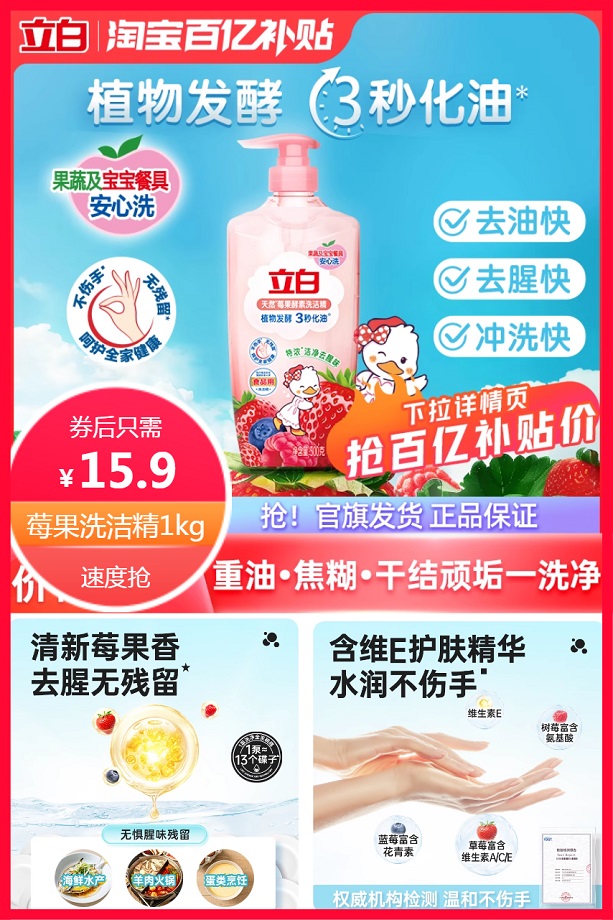拍1kg选项,下拉详情淘金币15.1元到手2斤,立白清新莓果洗洁精,去腥无残留,洁净配方,酵素因子3秒去油,10项0添加,奶瓶果蔬安心洗,含维e护肤精华,水润不伤手!