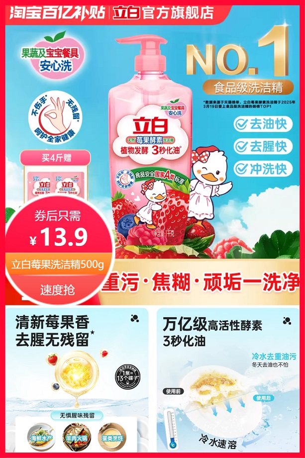 拍1kg选项,下拉详情淘金币省0.6元后约15.3到手2斤,立白清新莓果洗洁精,去腥无残留,洁净配方,酵素因子3秒去油,10项0添加,奶瓶果蔬安心洗,含维e护肤精华,水润不伤手!