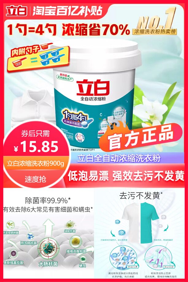 【下拉详情淘金币省2.05元后约15.85元,赠运费险】立白全自动浓缩洗衣粉900g,浓缩耐用,一勺抵四勺,除菌除螨,有效祛除真菌和螨虫,去污不发黄!