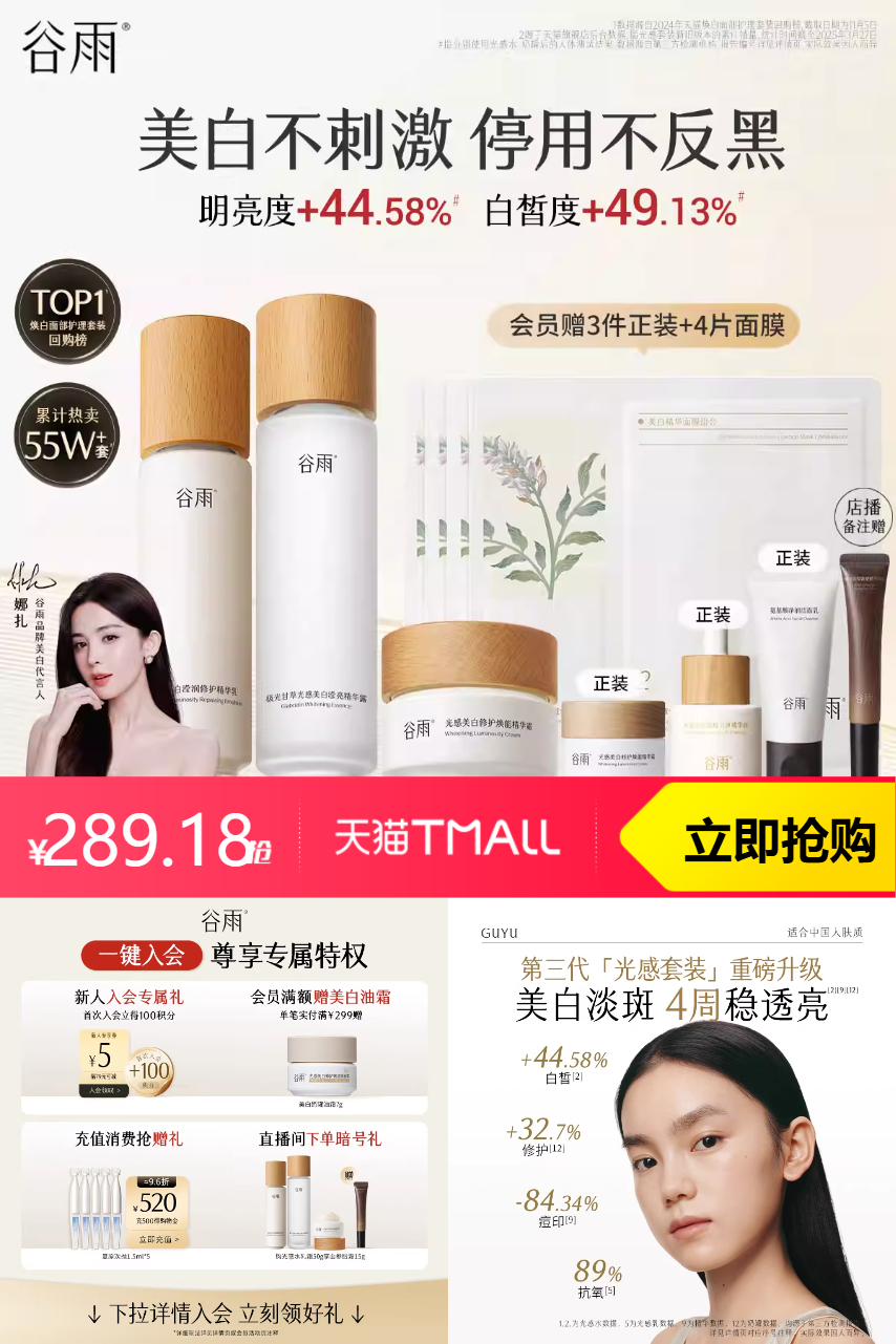 【立减110+会员券10+淘金币39.82+消费券25+88vip抵扣16.45到手247.73+加赠光感水35ml+美白奶罐15g+淡斑瓶5ml+面膜3片】谷雨第三代光感水100ml+第三代光感乳100ml,赠品:光感水35ml+美白奶罐Pro15g+淡斑瓶5ml+新一代奶皮面膜3片