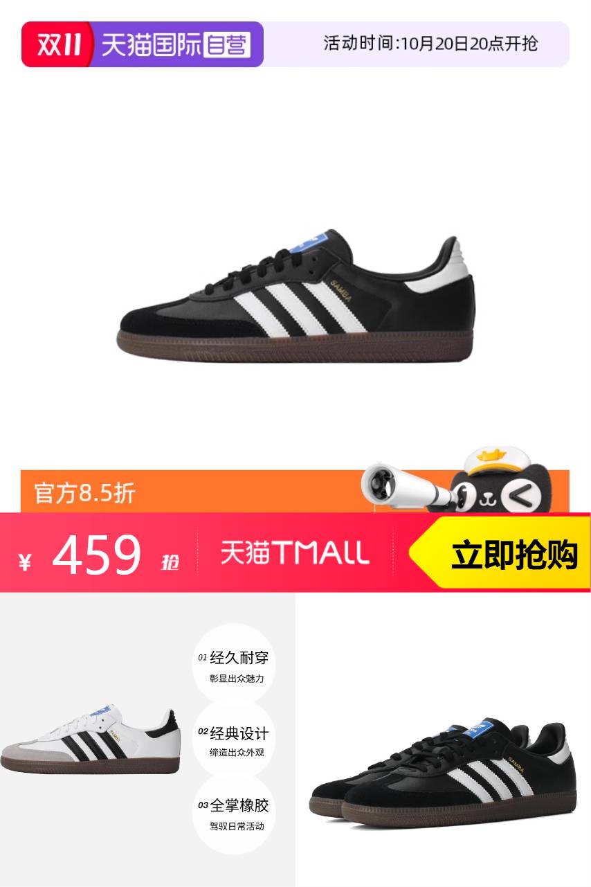 【有6.38元淘金币,叠999-100大额券和88vip的9折消费券,88vip凑单到手334.87】阿迪达斯SAMBA运动鞋,经典三条纹鞋面,橡胶鞋底,防滑耐磨,低帮舒适,男女同款,趁活动优惠赶紧入!