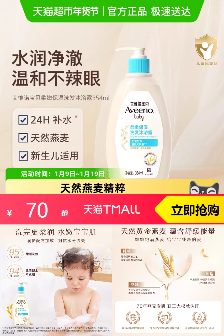 【官方立减70元,购物券10元,88VIP优惠3元,淘金币抵扣12.56元,品牌金减5元,凑满200减25消费券到手33-34】艾惟诺宝宝婴儿童沐浴洗发二合一滋润补水,燕麦精华温和滋养,洗发沐浴一瓶搞定!婴儿专用配方,0-6岁安心使用~
