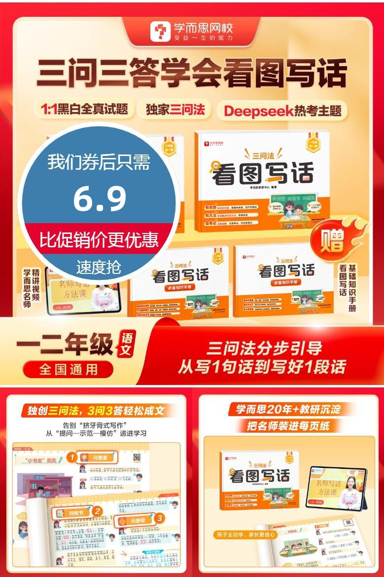 【赠基础知识手册】小学三问法看图写话,1:1黑白全真试题,独.家三问法,Deepseek热考主题,一主题一视频,孩子主动学,家长更省心,三问法分步引导,从写1句话到学好1段话,三问三答学会看图写话!