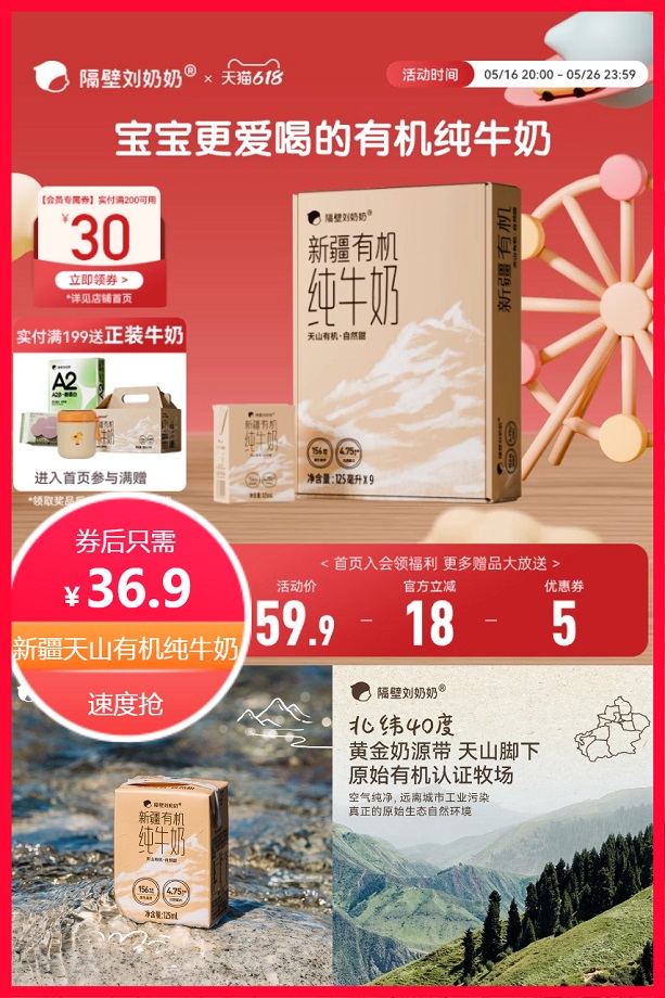 立减13元后约36.9元,进点浏览限时红包+88vip更实惠,隔壁刘奶奶新疆天山有机纯牛奶,黄金奶源,大自然的有机力量,3.8g蛋白125mL*9盒宝宝儿童纯牛奶