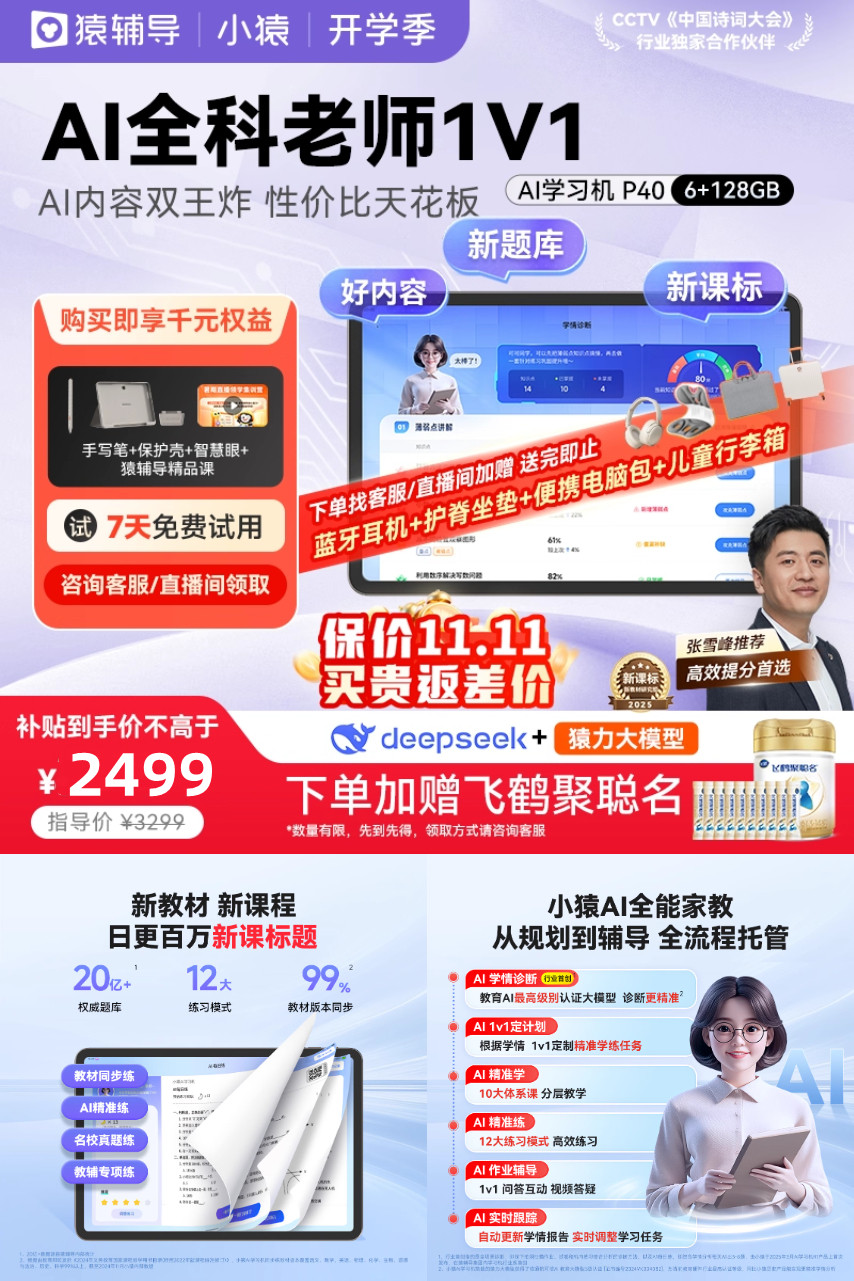【赠蓝牙耳机+电脑包+护脊坐垫+行李箱】小猿AI学习机P40,顶配资源,重磅接入deepseek,1对1专属AI家教,AI内容双王炸,精.准诊断,全流程作业辅导,性价比天花板!专为中小学打造!