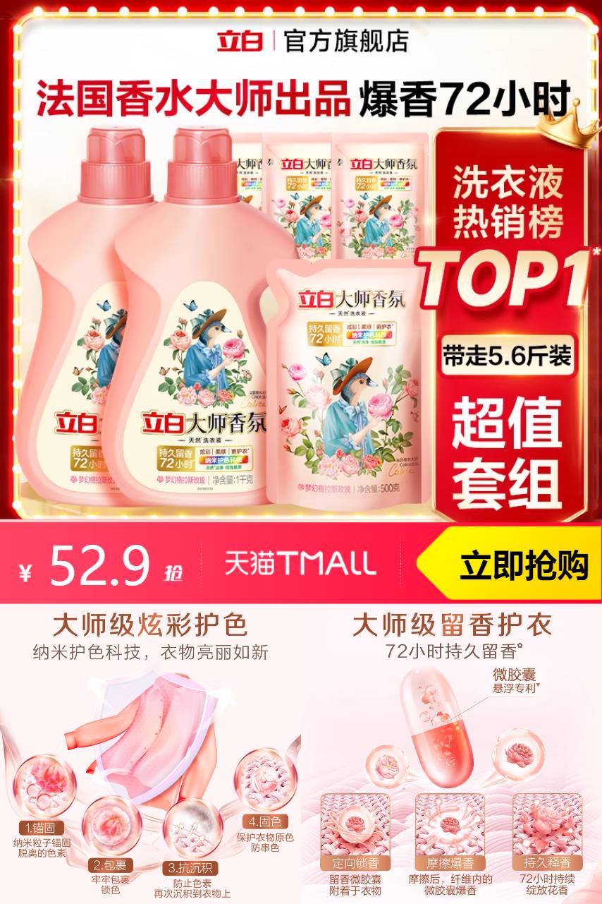 【1、百补直降 到手52.9,叠加消费券后45.3 2、赠送大师液100g*3+卫士液 100g*1 3、到27%】立白大师香氛洗衣液持久留香洁净护色,让洗衣变成一种享受~