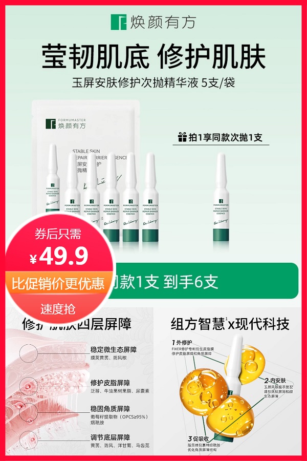 【到手只要49.9元!】焕颜有方玉屏安肤修护精华液,1修护2内安肤3促进吸收,修护肌肤四层屏障,让皮肤更好更光滑~