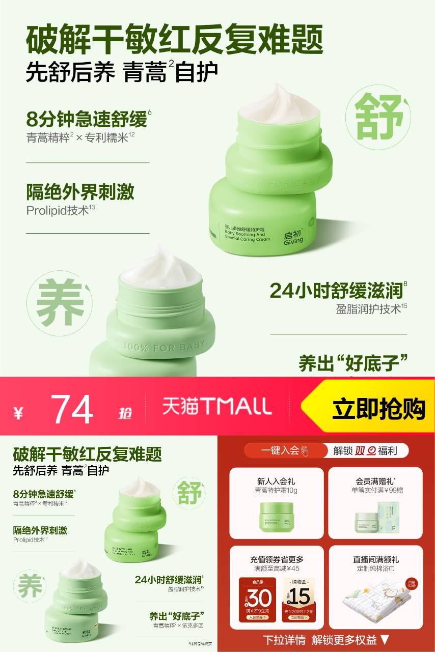 【官方立减13.8元,88vip9.5折抵扣3.7元,淘金币8.35元,年货节消费券抵扣7.7元,到手54.25元】启初儿童面霜保湿补水多维舒缓滋润霜青蒿,宝宝肌肤24h保镖,长效舒缓,医研青蒿,抑制泛红因子,双重呵护屏障,青蒿+依克多因养出“城墙皮”,补水锁水,玻尿酸+霍霍巴籽油~冰淇淋质地,水润好推开,精准养护,宝宝肌肤问题轻松拿捏~