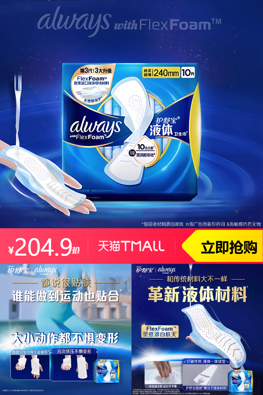 【优惠前204.9,叠加2.04元淘金币+满200-25消费券+0.38元其他红包,到手177.48元】护舒宝液体卫生巾箱装240ml*120片,一吸到底,反锁海量,吸后超薄,几乎没有存在感。
