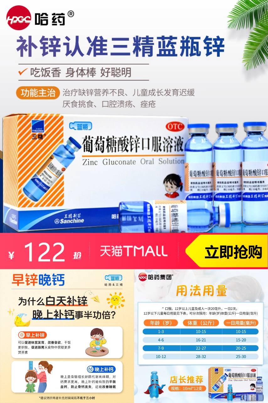 【秒杀到手原价240-优惠券20-秒杀直降98=122到手】三精牌葡萄糖酸锌口服液,吃饭香,身体棒,更聪明,补锌认准三精蓝瓶锌~