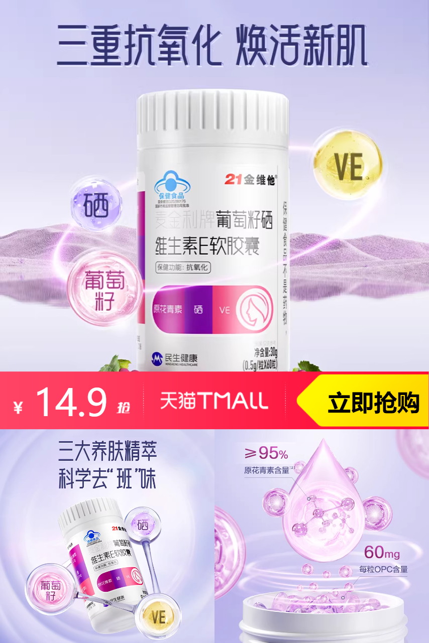 【淘金币1.5元,到手13.4元;】21金维他葡萄籽硒VE软胶囊60粒,葡萄籽+硒+VE三重抗氧化,想要抵抗岁月痕迹,就选这款21金维他葡萄籽硒维生素E软胶囊!它富含天然抗氧化成分,帮助您有效对抗自由基侵害,保持肌肤年轻态。