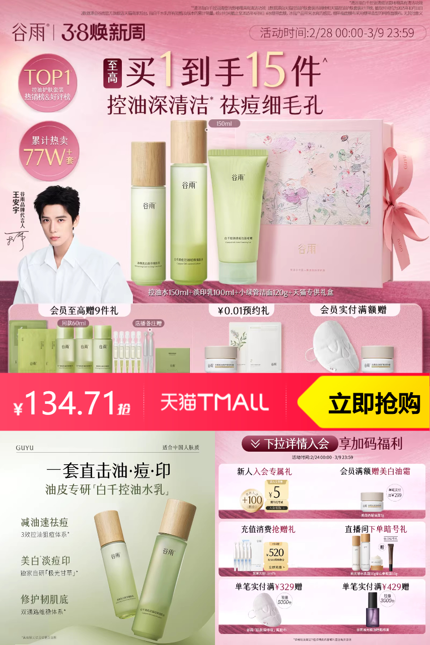 【立减60+淘金币28.27+超淘补贴11.02到手134.71+88vip抵扣8.15+消费券抵扣15.82到手110.74元+加赠控油水30×2+淡印乳30ml+次抛5支+面膜1+泥膜6g】谷雨白千控油水乳套装,祛痘淡印,专为油皮设计!控油清爽不拔干,改善痘痘肌问题~