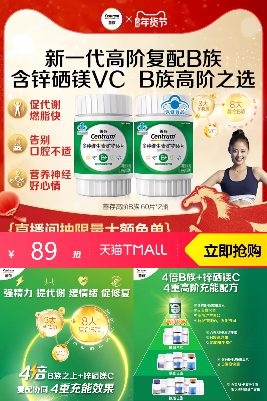 【页面价133-立减44-88vip95折4.45-淘金币11.97=72.58元,凑消费券到手更低】健康守护神,善存B族,能量之源,全面营养,VB精华,活力满点!