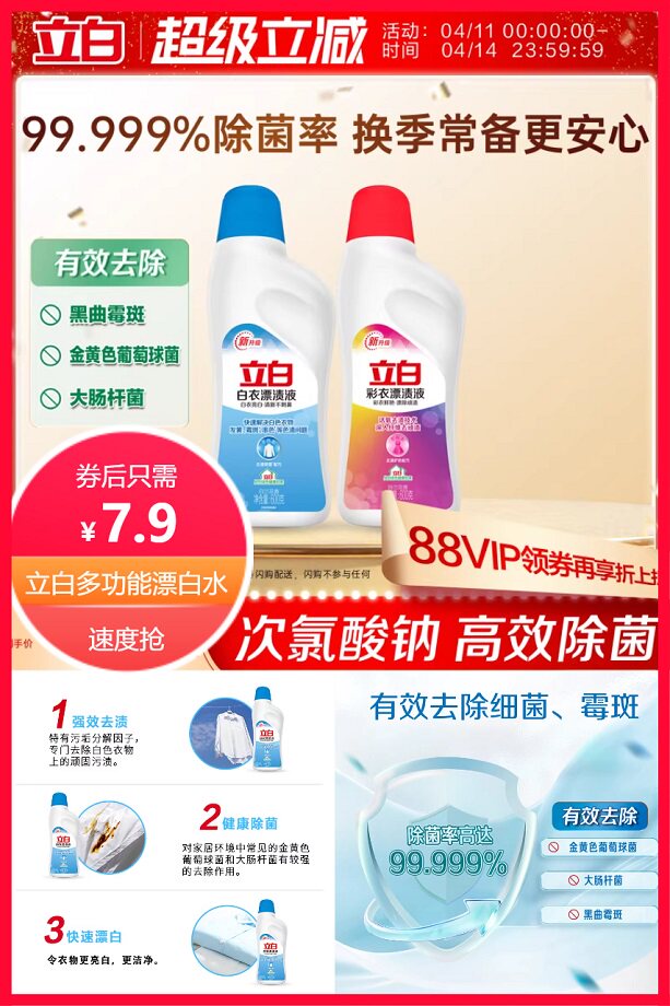 官方立减1.39元+下拉详情淘金币抵扣0.27元+88vip省0.4元后约7.23元更实惠,立白白衣彩衣漂渍液600g*1瓶,含次氯酸成分,安心防疫,除顽渍除菌洁净,彩衣鲜艳,气味清新,快抢购吧!!