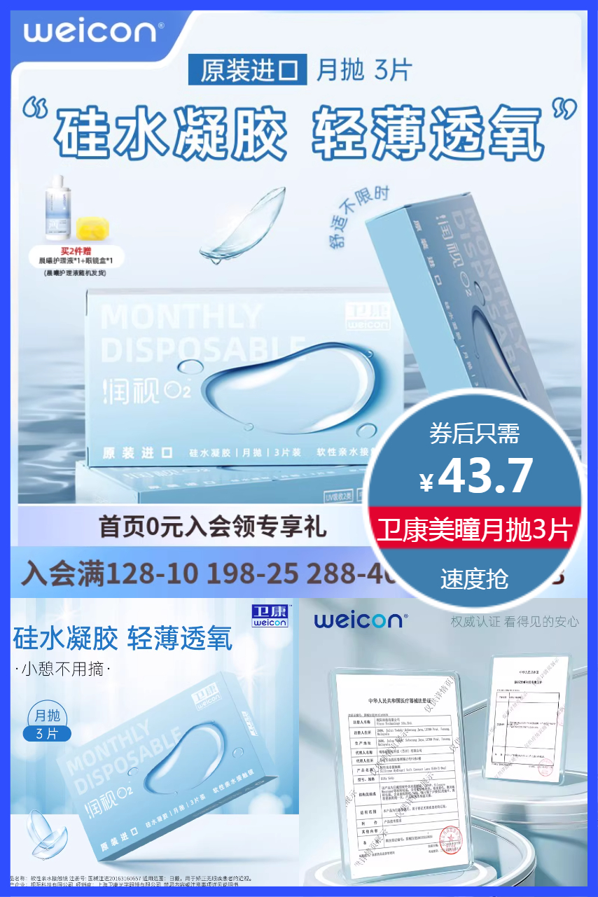 立减6元,首单3元,限时补贴1.3元88会员淘金币叠加劵到手38.42元!卫康隐形眼镜硅水凝胶月抛3片,原装进口,硅水凝胶,轻薄透氧,泪液自由循环,不易附着蛋白,含水量高,镜片柔软易戴,三重保湿,双眸水润舒适不干涩